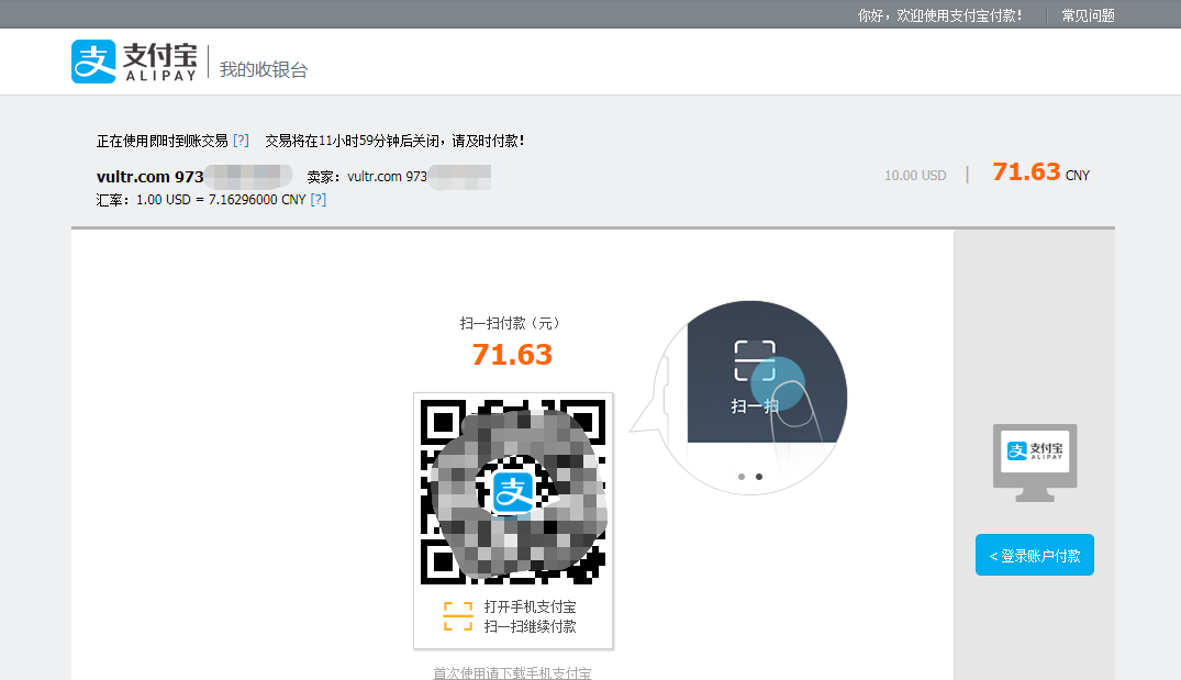 支付宝支付界面,用手机支付宝扫描即可完成支付,完成预付费充值